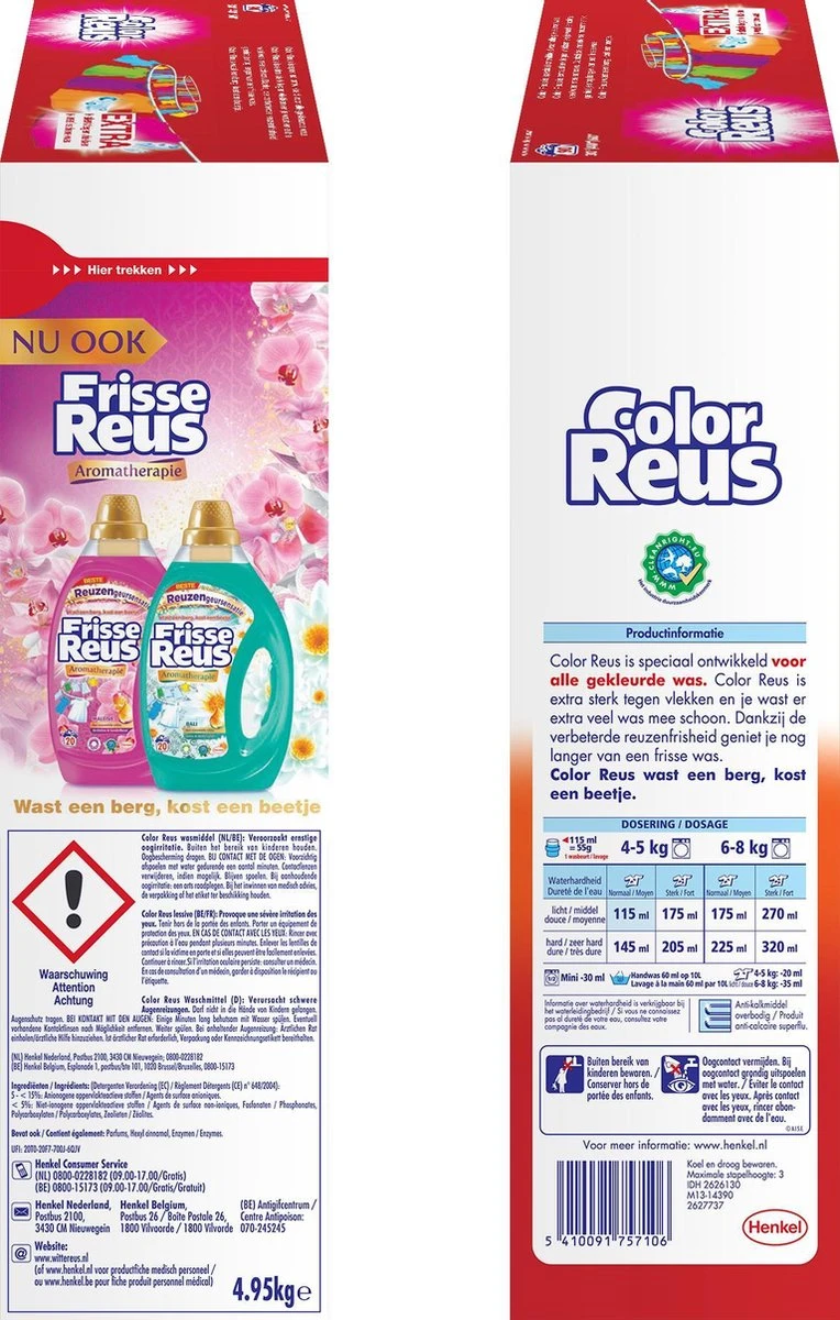 - De Color Reus waspoeder doos is gemaakt van 80% recycled karton en 100% recyclebaar!